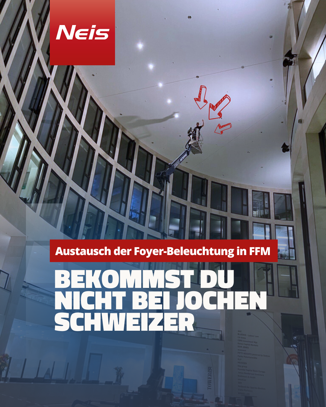 In einem Frankfurter Hochhaus musste die Beleuchtung in einem 4-Stockwerke hohen Foyer getauscht werden – nichts für schwache Nerven! Mit Präzision, dem richtigen Equipment und